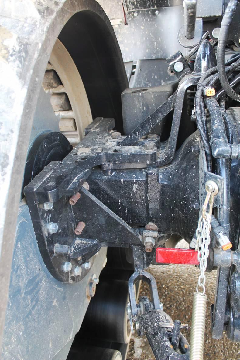 The Steyr 6230CVT at Leinster Hydraulics has four brackets installed at each wheel to support the fixed element of the track. Its design still allows the track to nose up or nose down over undulating ground or obstacles.