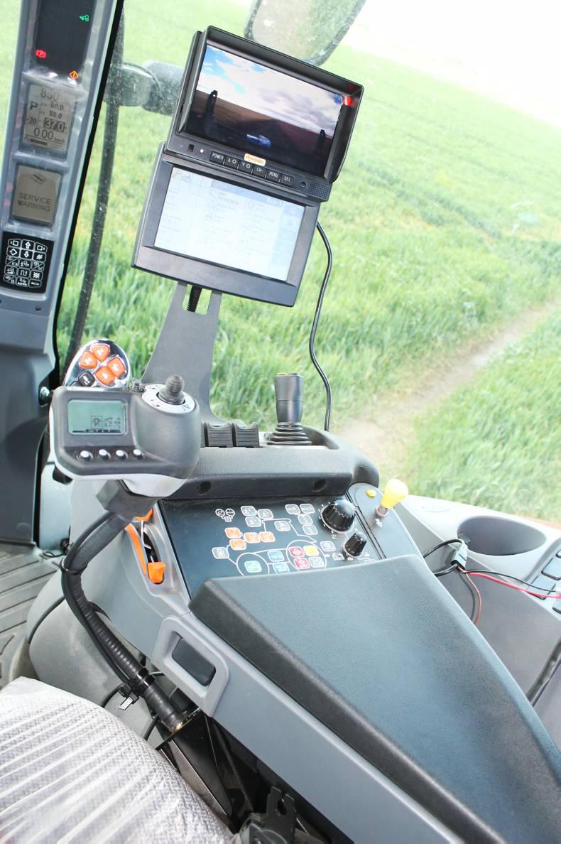 In the cab, he mounted the camera screen just above the tractor’s own arm rest-mounted display and it all works perfectly.