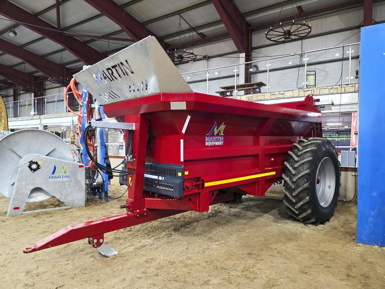 Martin Equipment showcased its new dung spreader for at the show in Cavan last week. The 10-tonne (t) rear discharge model on display comes fitted with a single set of floor chains, and features either manual or electric control of the floor speed.