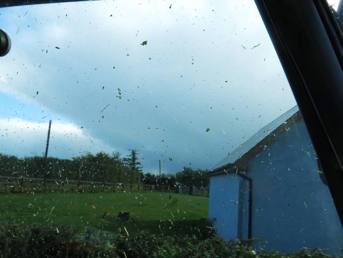 Just after starting, I encountered a rain shower that caused all the debris to stick on the glass. A side wiper would have allowed me to continue, but that is not too common unless retrofitted. The glass had to be wiped clean. Against the sunlight, it was nearly impossible to see out with the sap from the leaves.