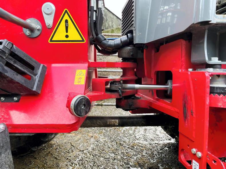 To check main pivot wear, apply downward pressure with the implement until the front wheels lift. Watch for movement at the pivot point and if the boom frame shifts more than 20mm toward the windscreen, it suggests significant wear. Proceed with caution and notify the seller.