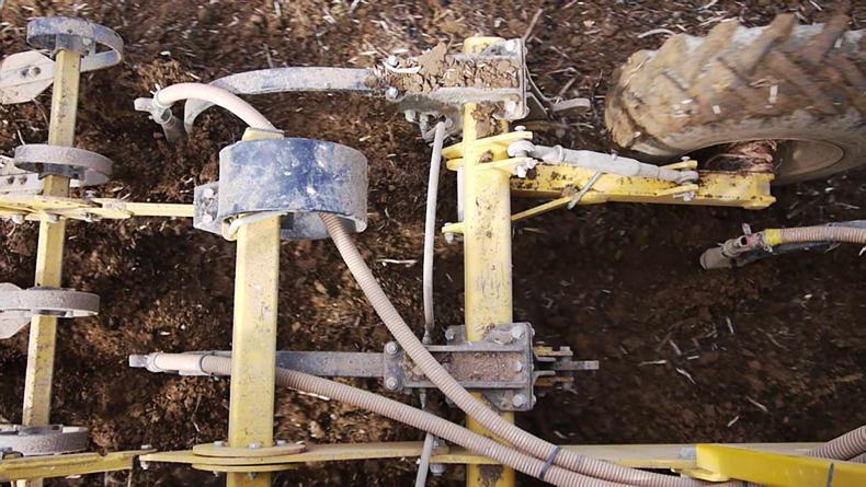 An A-share follows, placing the seed in a 5in band to the left and right of this drainage channel thanks to the seeding boot fitted to the rear.
