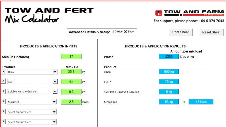 The mixes are calculated by using the machine's on-board weighing scales and by using the Tow and Fert mix calculator.