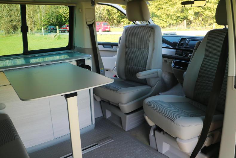 The swivel front seats turnaround to give the dining room scenario with the rear seats sliding forward to the foldable table