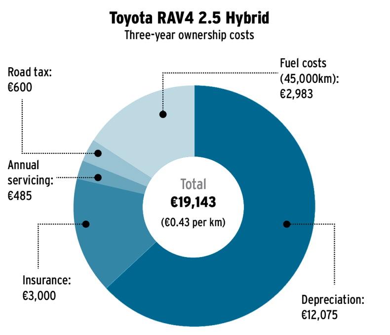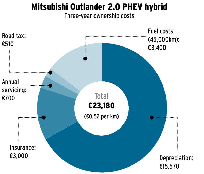 Calculate the numbers though and you’ll find that the actual fuel running cost differences are not that significant and you are doing your bit for the environment. Based on a 45,000km use level, the hybrid Outlander will cost you about approximately €870 more in fuel over three years, while the RAV4 extra hybrid costs will be about €512 over the diesel equivalent. Averaged out, that works out at about €230 per year extra cost and I believe that part is bearable for most drivers.