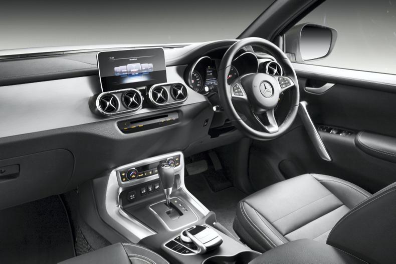 Mercedes is very well known for its luxury vehicles and also wellrespected for its production of vans and heavy commercial vehicles. So the fact that it has gone down the route of producing a pickup that fits snuggly in the middle of its current product offering is no surprise. The X-Class comes in three main specification levels – Pure, Progressive and Power. The Pure level is the basic spec with very few of the Mercedes-type luxuries included, but still with a very decent build quality. The Irish Farmers Journal brought one of these off-road and it felt like the sensible option, rather than bring the lush leather seats and deep carpet to play in the muck. The Progressive is expected to be the big seller of the range with lots of nice touches to make it seem a little more special than your everyday pickup. The Power spec gives you all the gadgetry that you expect from a top-of-the-range luxury vehicle. The X-Class is based on the Nissan Navara and is produced in Spain under licence at the same factory. Mercedes has made changes to every single body panel and the chassis has been upgraded with some Mercedes pieces to make the driving experience very much on the luxury end of the market.