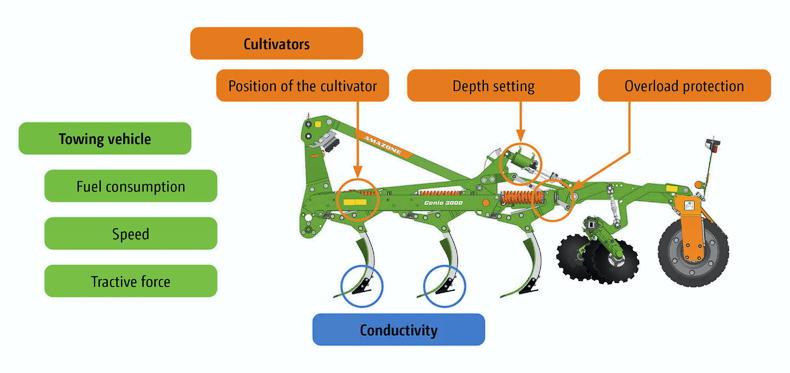 The multi sensor system on the cultivator measures working depth, field slope, over load protection and position in addition to a four-point system which measures soil conductivity via the soil engaging tines. These measurements in addition to tractor data such as diesel consumption, engine speed, engine load, and forward speed along with soil conductivity and resistivity are then processed using AI algorithms to form a detailed soil map.