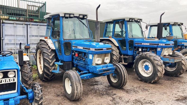 A 1986 Ford 7910 Series II Super Q cab model sold for €21,055 (£18,000) plus VAT, a Ford 8730 power shift Series III model with front linkage sold for €20,470 (£17,500) plus VAT, and a 1990 Ford 6410 Series III showing 2,292 hours sold for €19,885 (£17,000) plus VAT.
