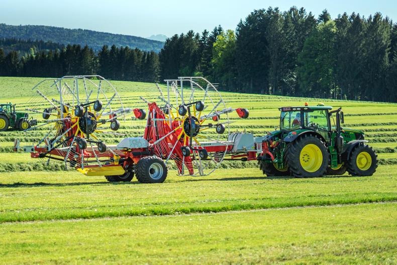 Rotor weight alleviation is similar, hydraulic on the front and mechanical on the rear. The degree of weight alleviation is automatically adjusted depending on the set working width. Pöttinger says this exerts less pressure on the rotor units leading to less wear and tear.