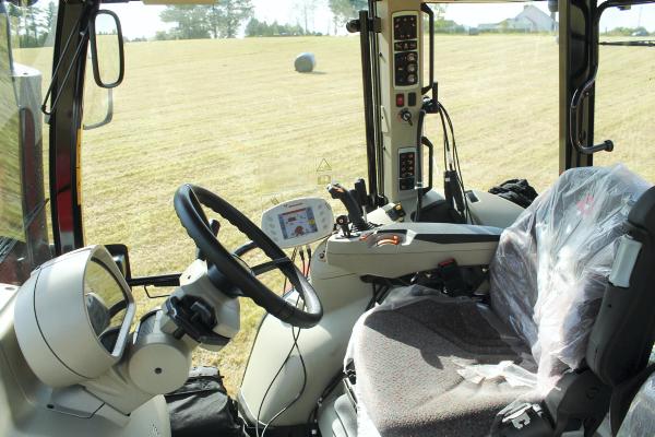 We also found that the powershift speeds were smooth throughout baling. Front-axle and cab suspension adds to overall comfort in the field, making this a pleasant tractor to drive.