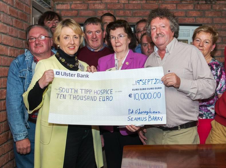 The Coolmoyne and Moyglass Vintage Club, which organised the very successful silage extravaganza on 26 July recently handed over a cheque for €10,000, the proceeds from the event, to the members of the South Tipperary Hospice.