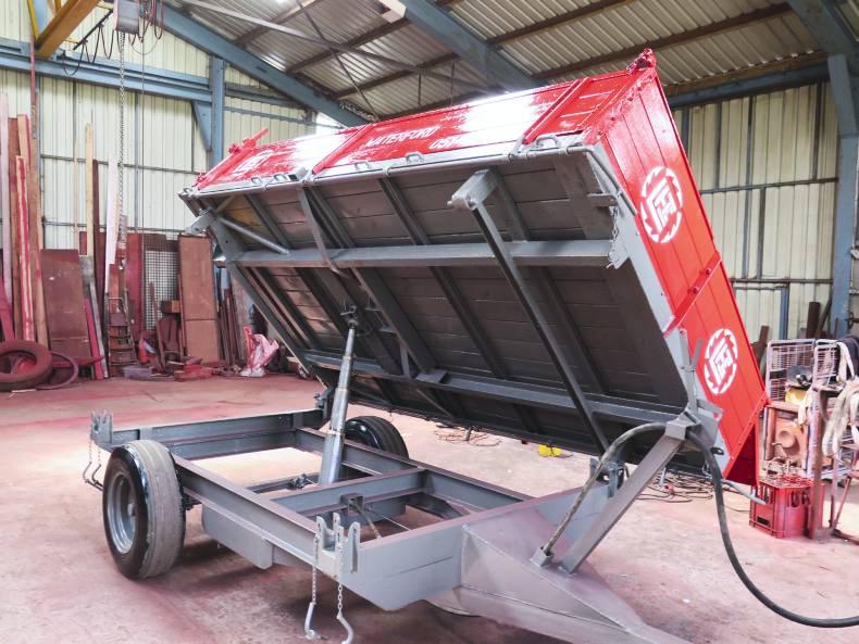 Paddy sourced the four-section hydraulic tipping ram and set about making the trailer. He had not travelled to the continent where three-way tipping trailers were in use. He developed his own approach, using a ball-type coupling under the ram. He developed a robust flange design to allow locking pins to be inserted at four points on the trailer chassis, to give the various tipping choices.