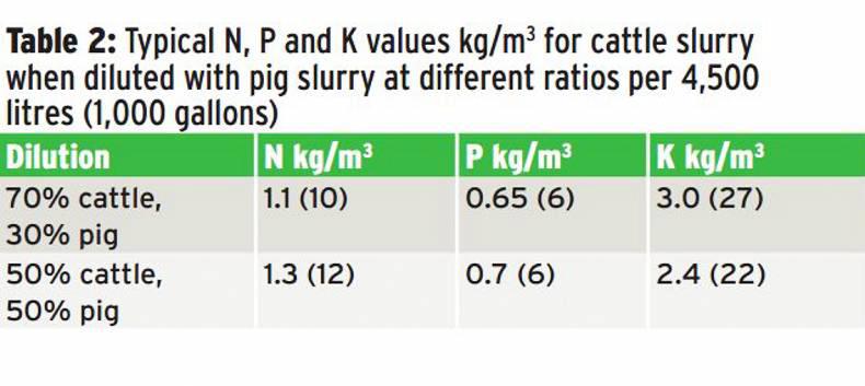 The available N-P-K value of 70:30 and 50:50 mixtures of cattle and pig slurry are shown in Table 2. Before importing pig slurry, check your farm fertilizer plan to determine the volume that can be imported on to the whole farm.