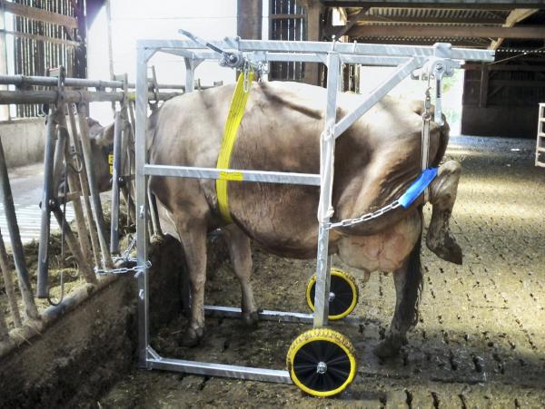 It is easy to transport, with a hoist winch belt that prevents a cow from going down when she is being pared. A winch is included that can hoist hind and front legs.