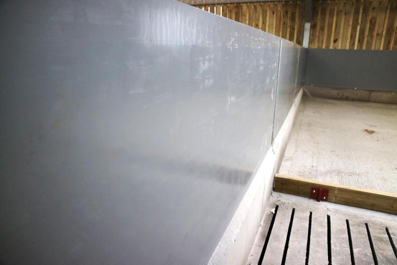 Another key feature of the shed is the Paneltim plastic wall panels. These are designed to allow for efficient and effective cleaning of a pen. Concrete can become porous and cracked, especially as it ages. This provides areas for bacteria to survive in. The panels used here are fixed on a small stub wall. Panels are 1m high and come in varying lengths. The panels were supplied by Access Plastics from Ashbourne Co Meath.