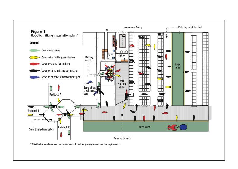 Figure 1 shows how the robotic system works on the Kierseys’ farm. This is guided cow traffic. The two robots are situated inside the cubicle shed. This means they can be used for indoor milking if weather conditions are not suitable for grazing or if they ever decided to winter milk.