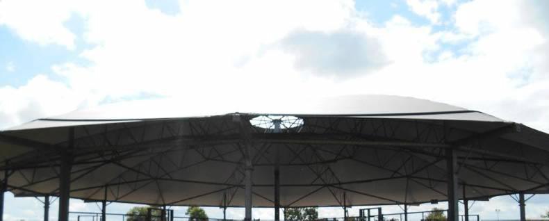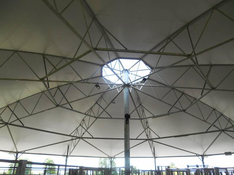 A roundhouse is an uncommon building design for a cattle shed. Circular in shape, it contains a central handling area and the roof is made from a single sheet of high-tensile PVC-coated polyester fabric.