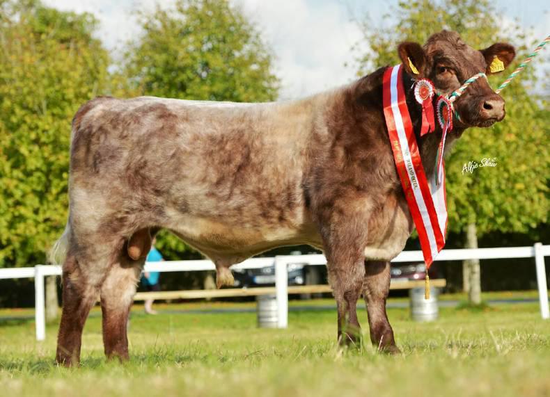 The reserve male champion at the Salers show and sale in Tullamore was Lisnalee Noel, sired by Corlurgan Ourson (OUR) and owned by Patrick McIntyre, Lisnalee Salers, Bailieboro, Co Cavan. Pictured above with the reserve champion is Liam McIntyre.
