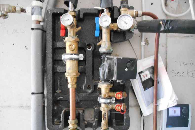 Some of the pipes coming from the tank have mixing valves installed. This enables cold water to be mixed with warm water. A thermostatic valve then regulates the temperature of the water going to the different areas.