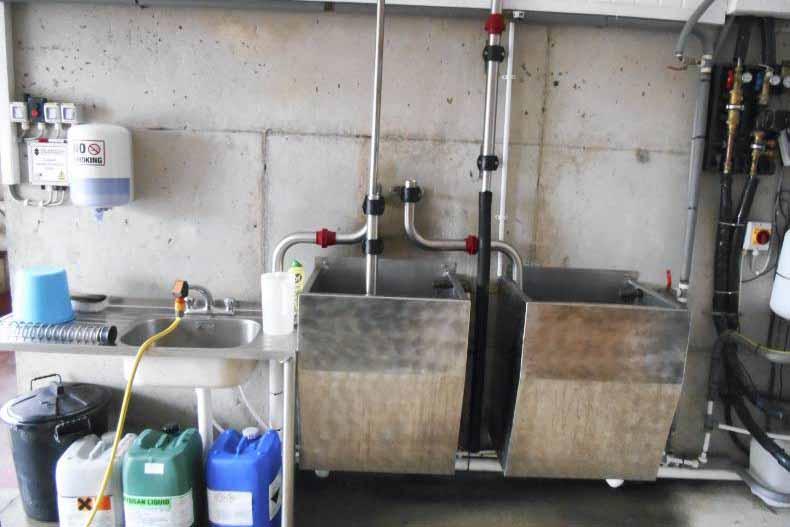 The top pipe, for example, leads to a handheld hose for the parlour pit.