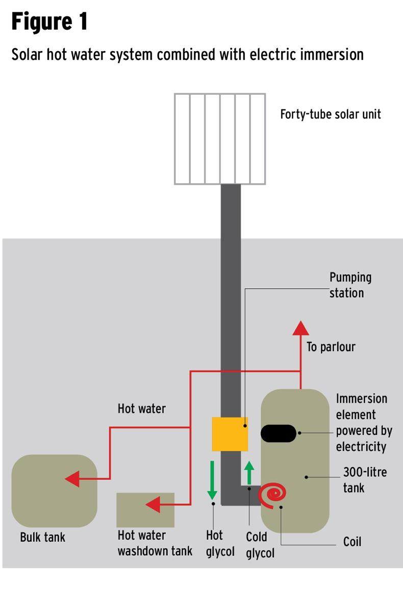 The reason he thinks it is ideal for a spring-calving herd is because the timeframe when hot water is needed most (February to late October) also coincides with the period that solar heating is at its optimum. November to January are the shortest days of the year and usually the least productive for the solar heating system. During the summer, the majority of the hot water is heated by the solar system, according to Greg.