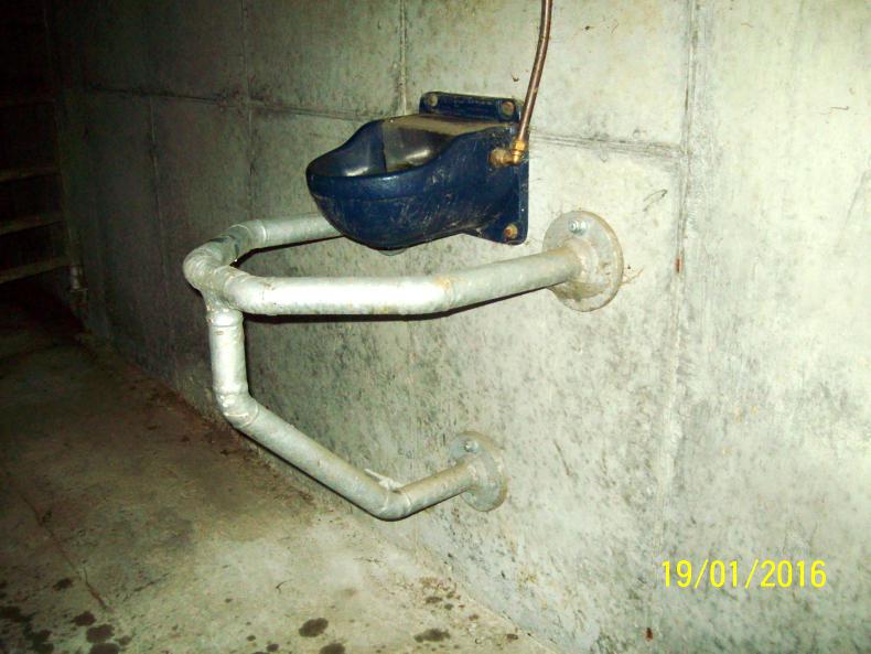 James Byrne from Enniskerry, Co Wicklow, designed a steel protection guard that keeps the cattle’s hindquarters away from the trough. His local fabricator manufactured it and he had it galvanised later. James said it was fabricated with 40mm steel pipe, with pipe flanges for fixing to the wall. It is about 500mm wide and 500mm off the wall. Since these were fitted, the problem has been eliminated, according to James.