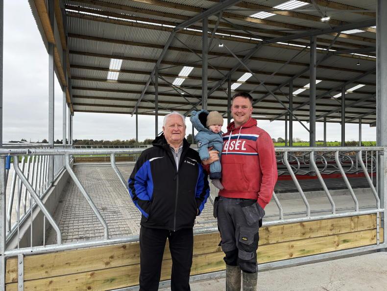 Tommy Snr, Tommy Jnr and Tom Phelan outside the newly built cubicle shed on their farm in Castletown, Co Kilkenny.