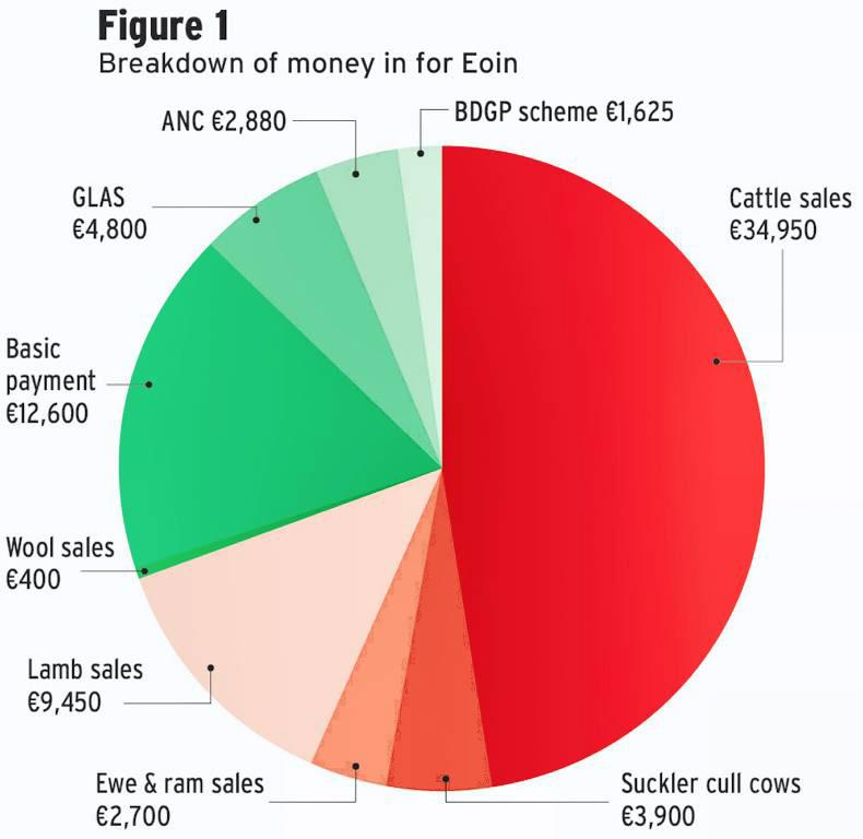Figure 1 shows the money coming into the farm in 2016. Over 70% (€51,400) of the €73,000 income that comes into the farm is from sales of beef and lambs.