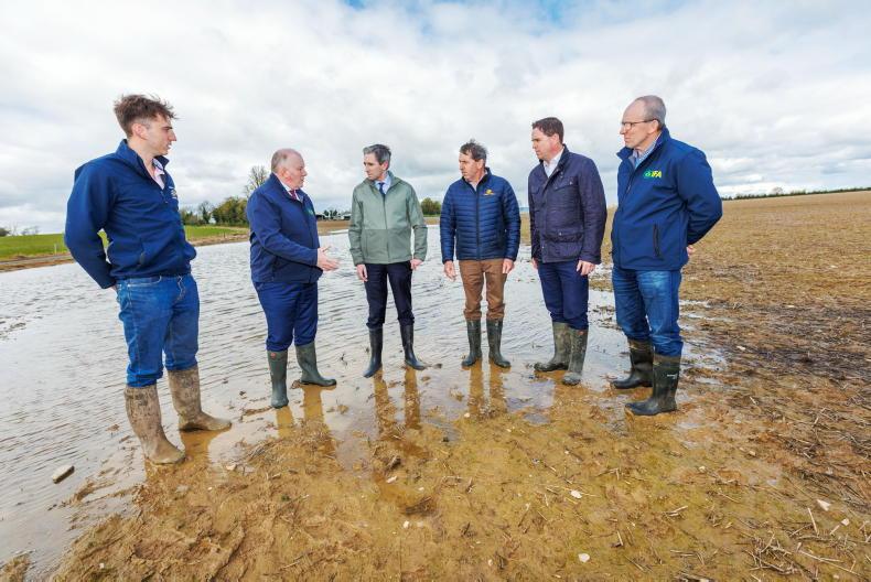 Charles Farrell, farmer; IFA president Francie Gorman; Taoiseach Simon Harris; Charlie Farrell, farmer; Minister Martin Heydon and IFA Kilkenny chair Brendan Hickey, on the Farrell farm in Gowran, Co Kilkenny, discussing the challenges for farming. The Farrells run a tillage and drystock farm and facilitated the first meeting between IFA president Francie Gorman and Taoiseach Simon Harris. \ Michael O’Rourke