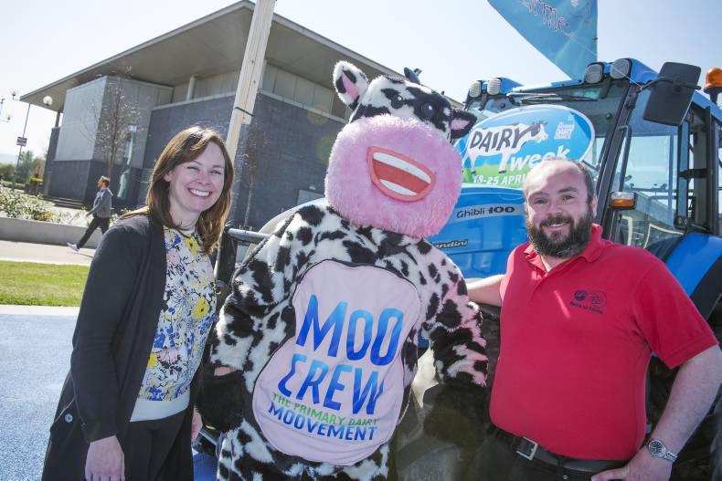 22/04/2015. Pictured are (LtoR) Tara O'Regan, of the National Dairy Council, Milly the Cow and Kieran O'Dowd, Macra National President, at Macra's Dairyfest in UCD for National Dairy Week with Milly the Cow. Photo: El Keegan
