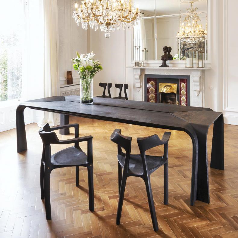 Quadriptych, by Alan Meredith Studio. Using the steam bending technique, furniture surfaces become table legs using a single plank of oak. The wood undergoes scorching and fuming, whereby ammonia fumes interact with the oak's natural whereby tannin to change its appearance.