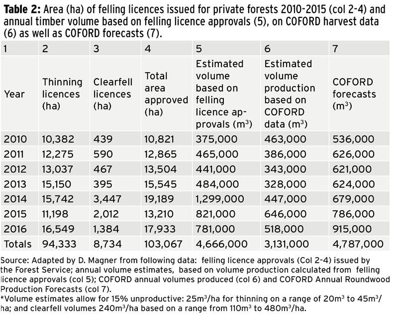 If harvesting is estimated from felling licence approvals, the average volume should be 666,000m3 based on conservative average thinning (25m3/ha) and clearfells (270m3/ha) to allow for low-yielding crops and premature clearfells, especially after windblow (Table 2). Optimum thinning volumes for conifers is 45m3/ha and 480m3/ha for clearfells.