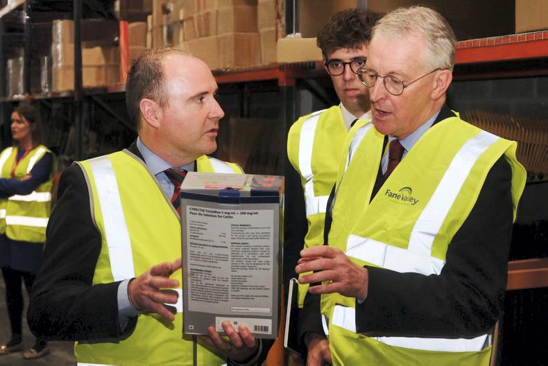 Mark Little (left), Veterinary advisor Fane Valley, raised the issue of access to veterinary medicines from Britain to NI with The Secretary of State , Hilary Benn when he visited the Fane Valley headquarters in Moira