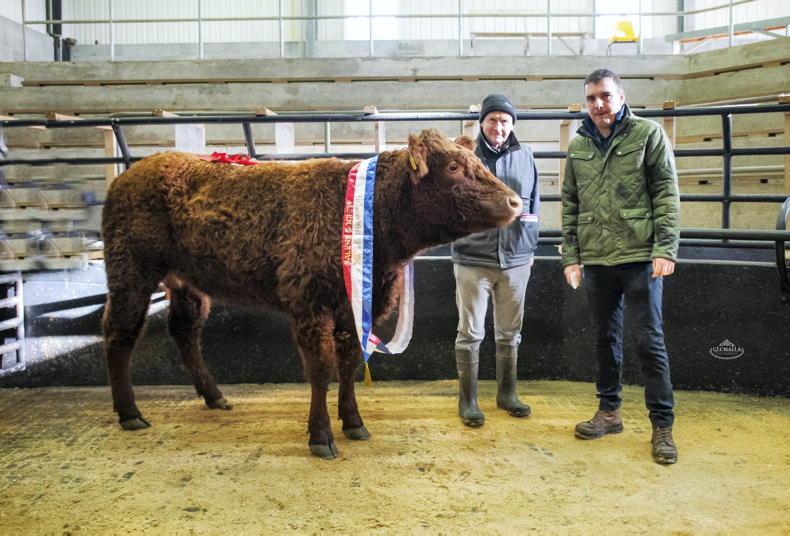 Bernard Hunt and judge Kieran Flatley with the Reserve Champion that sold for €3,000 at the Irish Salers Cattle Society show and sale. \ Glenalla Photography
