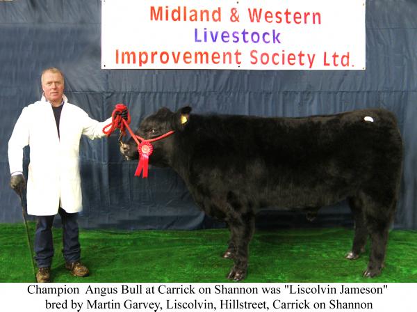 In the ring, the champion Angus bull, Liscolvin Jameson, sired by Crussin Mark, was bred by Martin Garvey, Hillstreet, Carrick-on-Shannon and sold for €3,600. In reserve was Clooncolligan Judge, a Ballymagrine Wonder son, bred by Kevin Diffley, Bornacoola. He was unsold in the ring.