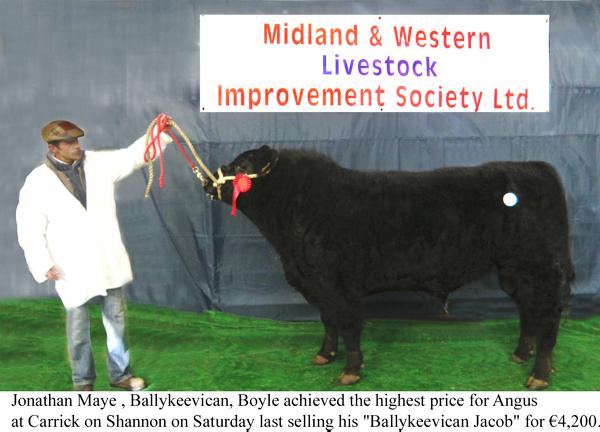 A top price of €4,200 was received by Jonathan Maye, Ballykeevican, Boyle for Ballykeevican Jacob, a Kingsbrook Emperor son at the recent Midland & Western Livestock Improvement Society show & sale in Carrick-on-Shannon.