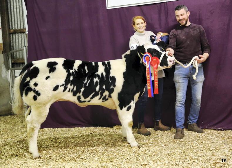 Niamh, Dáithí and Chris Meehan with Moneypenny, the junior Belgian Blue champion and top-priced animal at the 2022 Winter Fair selling for €14,500. \ Tricia Kennedy