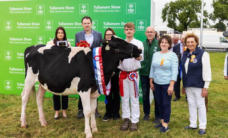 Champion Dairy Shorthorn owned by James Lambe from Monaghan pictured with Minister for Agriculture, Food and the Marine Charlie McConalogue and representatives from Tullamore Show and FBD at the 2024 Tullamore Show. \ Alf Harvey.