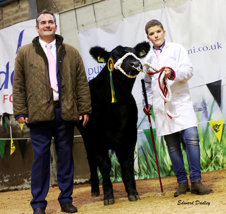 Bailey Smyth, Strabane, was the winner of the junior handling class at the NI Aberdeen Angus Club's 14th annual calf show, in Dungannon. He was congratulated by judge Rob Bishop, Berkshire. \ Edward Dudley