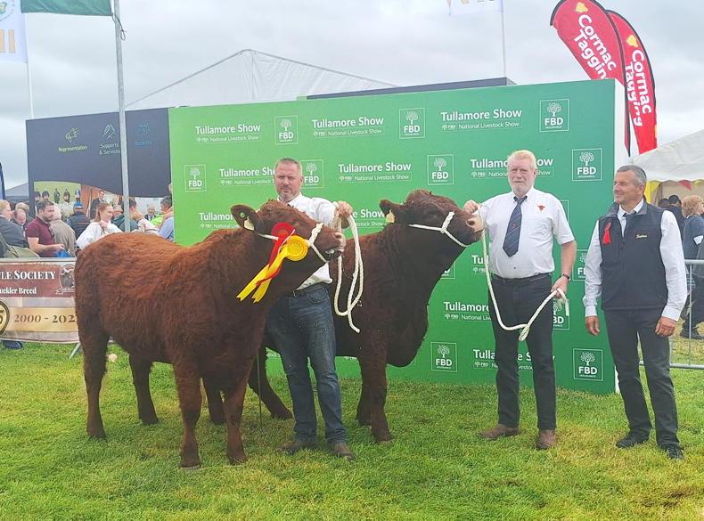 The best pair of animals in the Salers went to Donegal breeder Ryan Griffith, with James McGrothy and French judge Alex Seyrolle. \ Nevan McKiernan