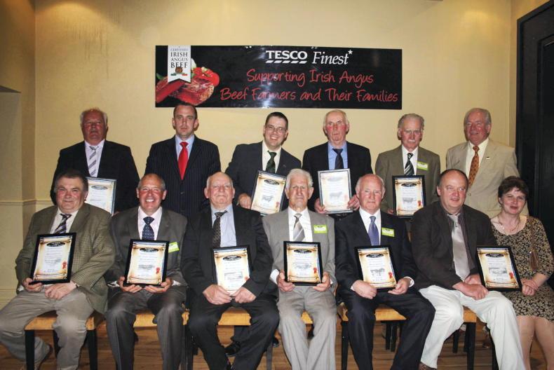 Bovine winners in the recent Hall of Fame Awards in Athlone: front, Michael Conway Kilrush, Irish Shorthorn Cattle Society, Martin McCullagh, Navan, Irish Limousin Cattle Society, Michael Yorke, Ballymahon, Commercial Cattle Exhibitors Society,Tom Joe Riordan Fermoy, Irish Simmental Cattle Society Society Brother Gerard Cahill, Marist Residence Athlone, Irish Holstein Friesian Association, Richard and Brid Duff, Portlaoise, Belgian Blue Cattle Breeding Society, Back L - R : Billy Gubbins, Kilfinane, Irish Charolais Cattle Society, Justin McCarthy, former Irish Farmers Journal editor, Oliver Flanagan, Irish Angus Cattle Society, Tom Fitzpatrick, Portlaoise, Salers, Cattle Society of Ireland, Michael Reynolds, Bornacoola, Irish Hereford Breed Society and Michael Flanagan CEO.