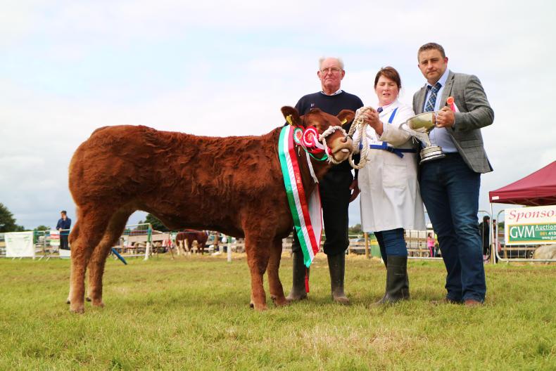 Supreme beef champion, commercial champion and the all-Ireland Limousin-cross champion at Cappamore Show was exhibited by Avril Gubbins, Cush House. Also pictured is Cappamore Show secretary Paddy Ryan and judge Pearse McNamee.