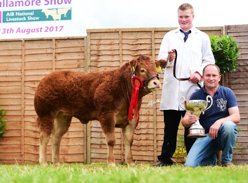 Jack Vahey exhibiting his first-prizewinning Carrowclogher Madonna. Jack was also placed top of the line in the national beef young stockperson competition, a title he also received in 2015. Also pictured is his father Sean Vahey. \ Alfie Shaw