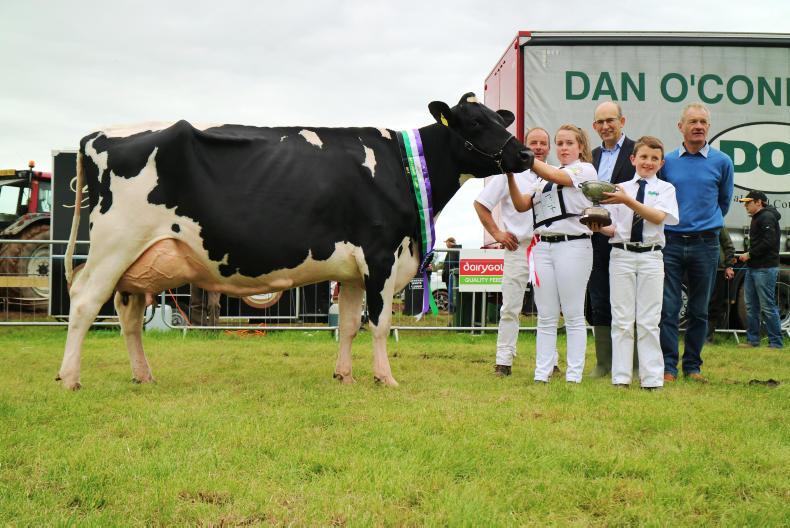 Barna Topshot, champion Holstein at Cappamore Show. Exhibited by Emma McNamara, with Michael and Conor McNamara, Jim Wolfe (Dairygold chief executive) and Sean McSweeney (Dairygold board).