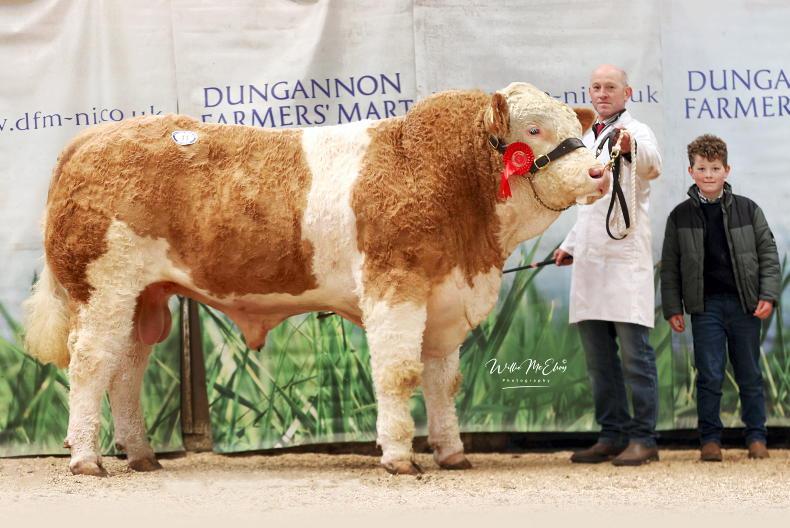 Records were blown away at the British Simmental Cattle Society’s show and sale at Dungannon Farmers Mart on Friday 27 March, when local breeder Ryan Gilmour sold Gillview Ranger for 10,000gns (€12,075).