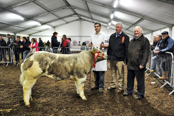 C Lynch, Baileboro, Co Cavan, with the Junior Belgian Blue Champion at the Carrick-on-Shannon Fatstock Show. Also in the picture are Alan McCrae (judge) and Hubert Maxwell.
