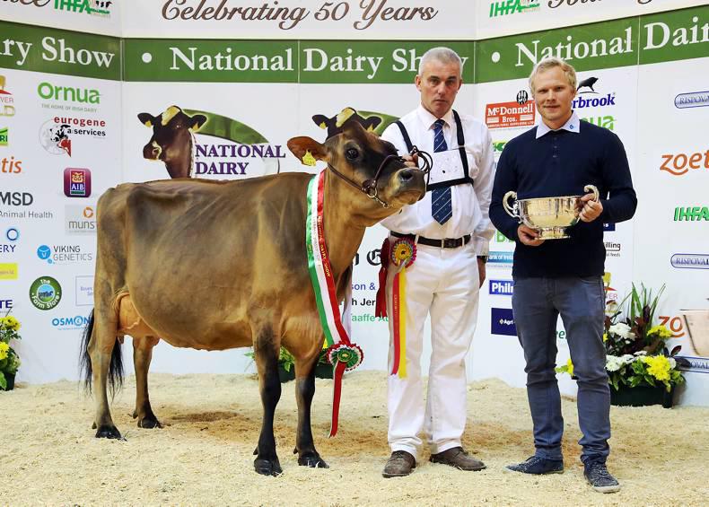 The Champion Jersey at the National Dairy Show in Millstreet Laurelelm Comereica Glamour, exhibited by Rickey Barrett, Togher, Cork, with sponsor Jan Anderesen of Viking Genetics. Photo: Maria Kelly