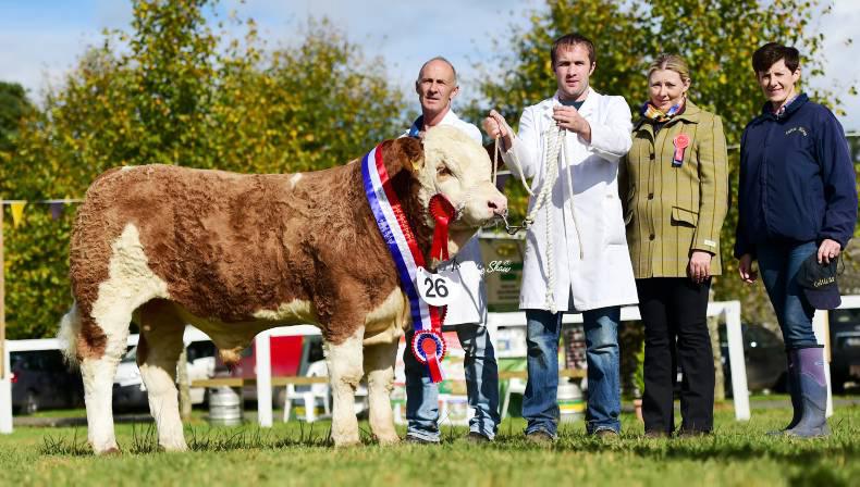 Lochview Gael Homemaker, the Celtic Sires-sponsored national junior Simmental heifer calf champion at Strokestown 2015, with Pat McNamee, sponsor Angela Brickley and judge Sharon Rothwell.