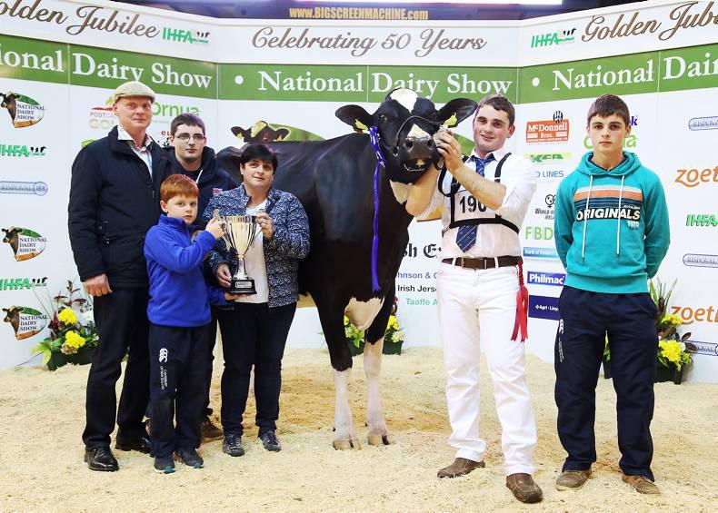 The reserve supreme champion at the National Dairy Show, Kingsleigh S901 Karry 604, with owners Shay, Michael, Colin, Margaret, David (handler) and Eoghan Nyhan, Ballinascarthy. Photo: Maria Kelly