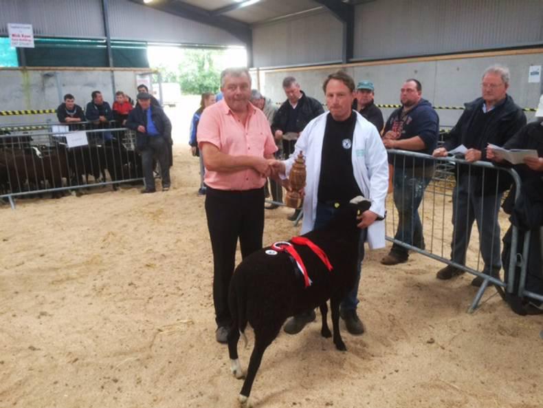 Francis Lyons with the supreme Zwartbles champion at Tullamore and show judge Melvin Mathews.